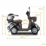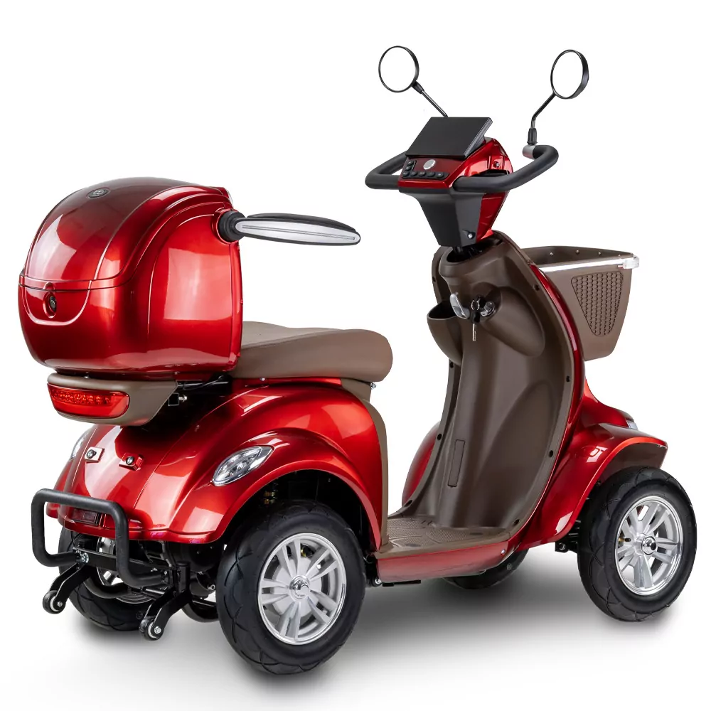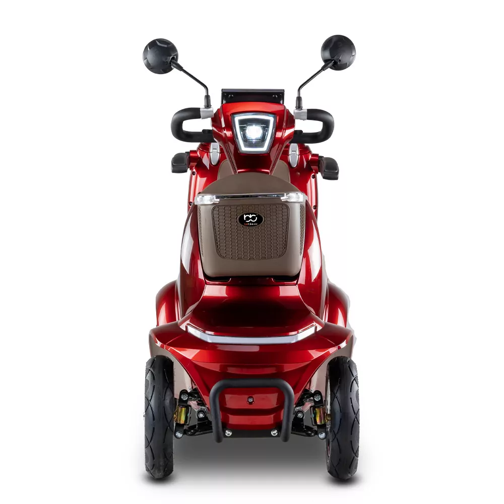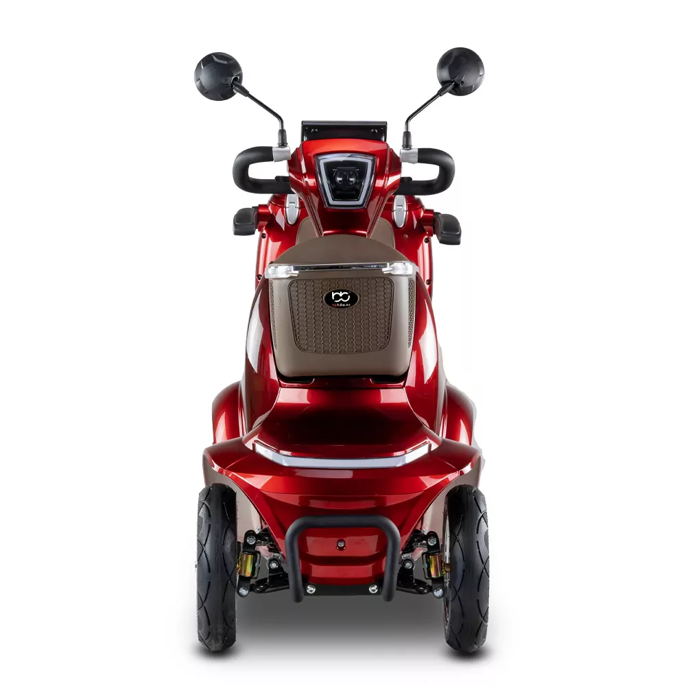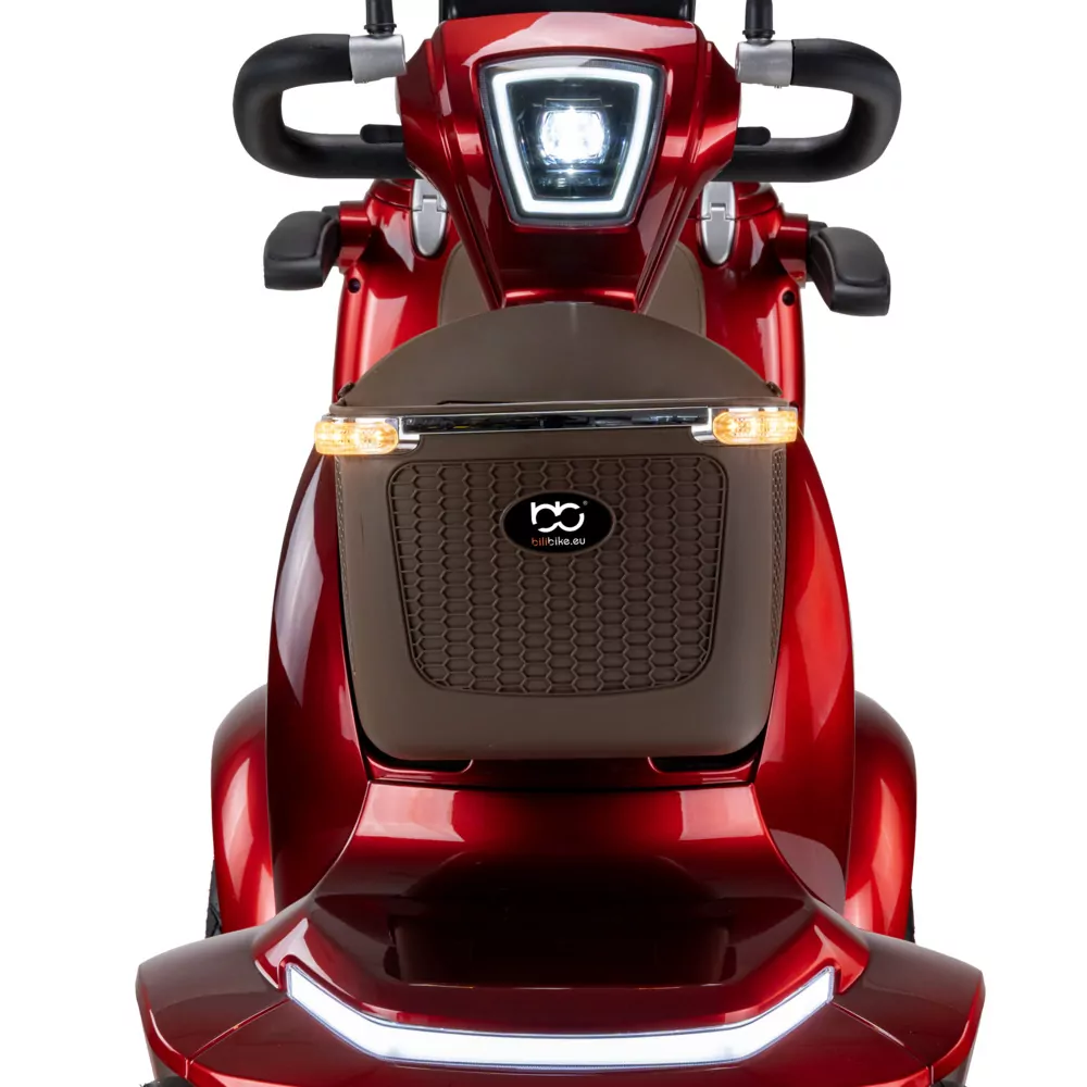Skuter elektryczny BILI BIKE SHINO G6-4  jest czterokołowym pojazdem elektrycznym pełnym udogodnień dla użytkowników. Posiada odchylane podłokietniki oraz wygodne siedzisko. Dzięki dodatkowym kołom pojazd jest bardzo stabilny, wsiadanie i zsiadanie jest wygodne. Pojazd wyposażono w zawieszenie, które znacznie podnosi komfort jazdy. Zamontowany koszyk oraz kuferek wraz ze schowkami zapewniają dużą powierzchnie transportu i są przydatne w codziennym użytkowaniu. Pojazd jest fabrycznie wyposażony w alarm. Za bezpieczeństwo odpowiadają automatyczne hamulce elektro-magnetyczne, które zatrzymują pojazd po puszczeniu gazu. Nowoczesność widać w dużym czytelnym wyświetlaczu oraz pełnym oświetleniu LED. Skuter ten gwarantuje niezależność i samodzielność.