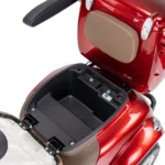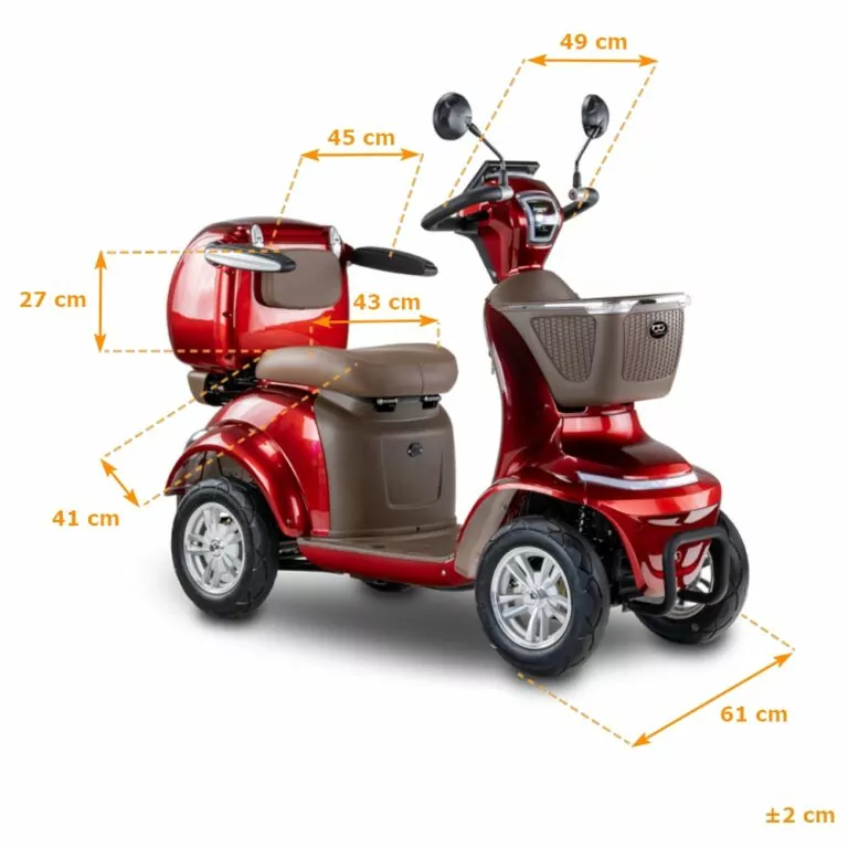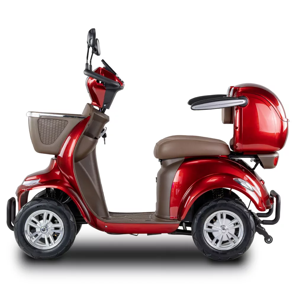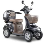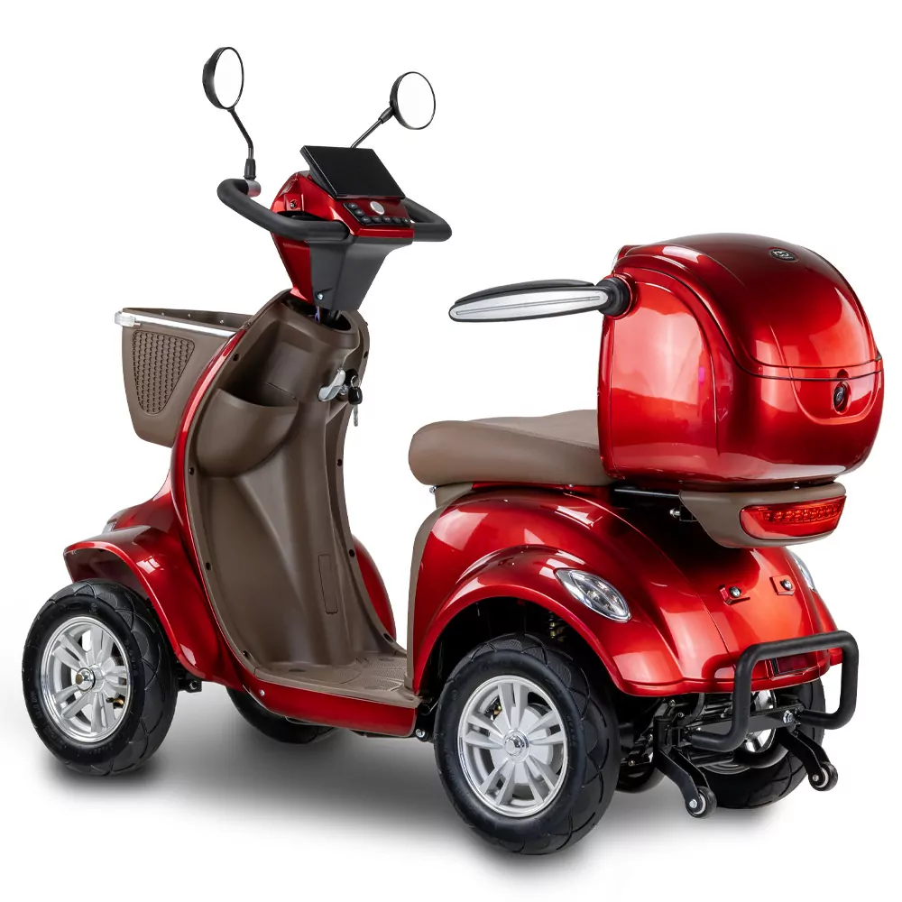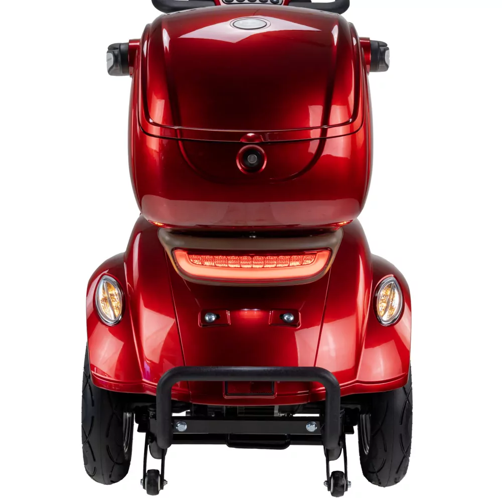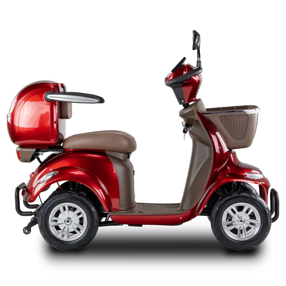 Skuter elektryczny BILI BIKE SHINO G6-4  jest czterokołowym pojazdem elektrycznym pełnym udogodnień dla użytkowników. Posiada odchylane podłokietniki oraz wygodne siedzisko. Dzięki dodatkowym kołom pojazd jest bardzo stabilny, wsiadanie i zsiadanie jest wygodne. Pojazd wyposażono w zawieszenie, które znacznie podnosi komfort jazdy. Zamontowany koszyk oraz kuferek wraz ze schowkami zapewniają dużą powierzchnie transportu i są przydatne w codziennym użytkowaniu. Pojazd jest fabrycznie wyposażony w alarm. Za bezpieczeństwo odpowiadają automatyczne hamulce elektro-magnetyczne, które zatrzymują pojazd po puszczeniu gazu. Nowoczesność widać w dużym czytelnym wyświetlaczu oraz pełnym oświetleniu LED. Skuter ten gwarantuje niezależność i samodzielność.