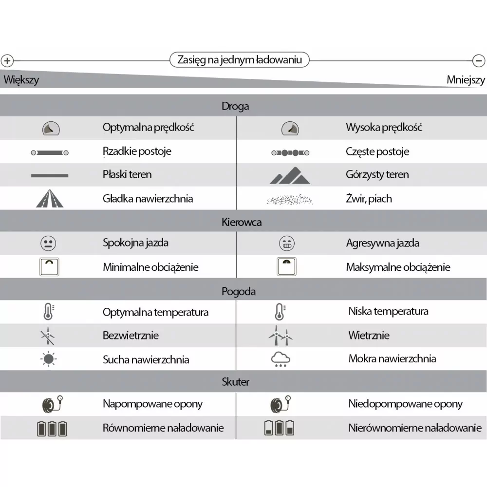 info: *Zasięg zależy od wagi użytkownika, warunków atmosferycznych, prędkości oraz podłoża.