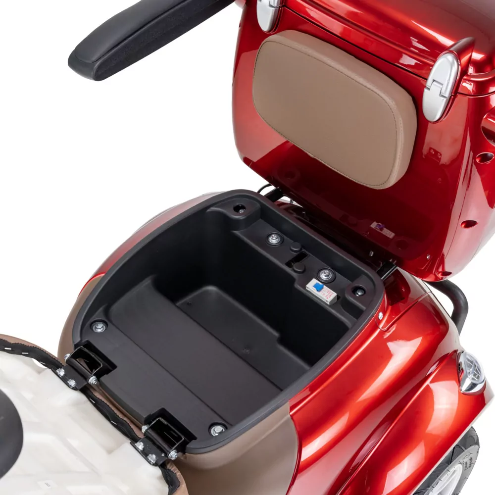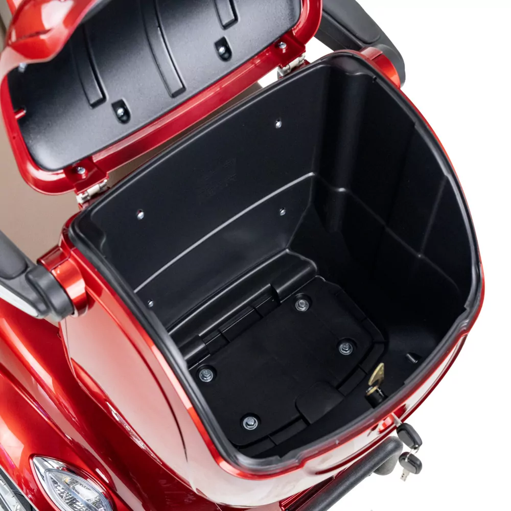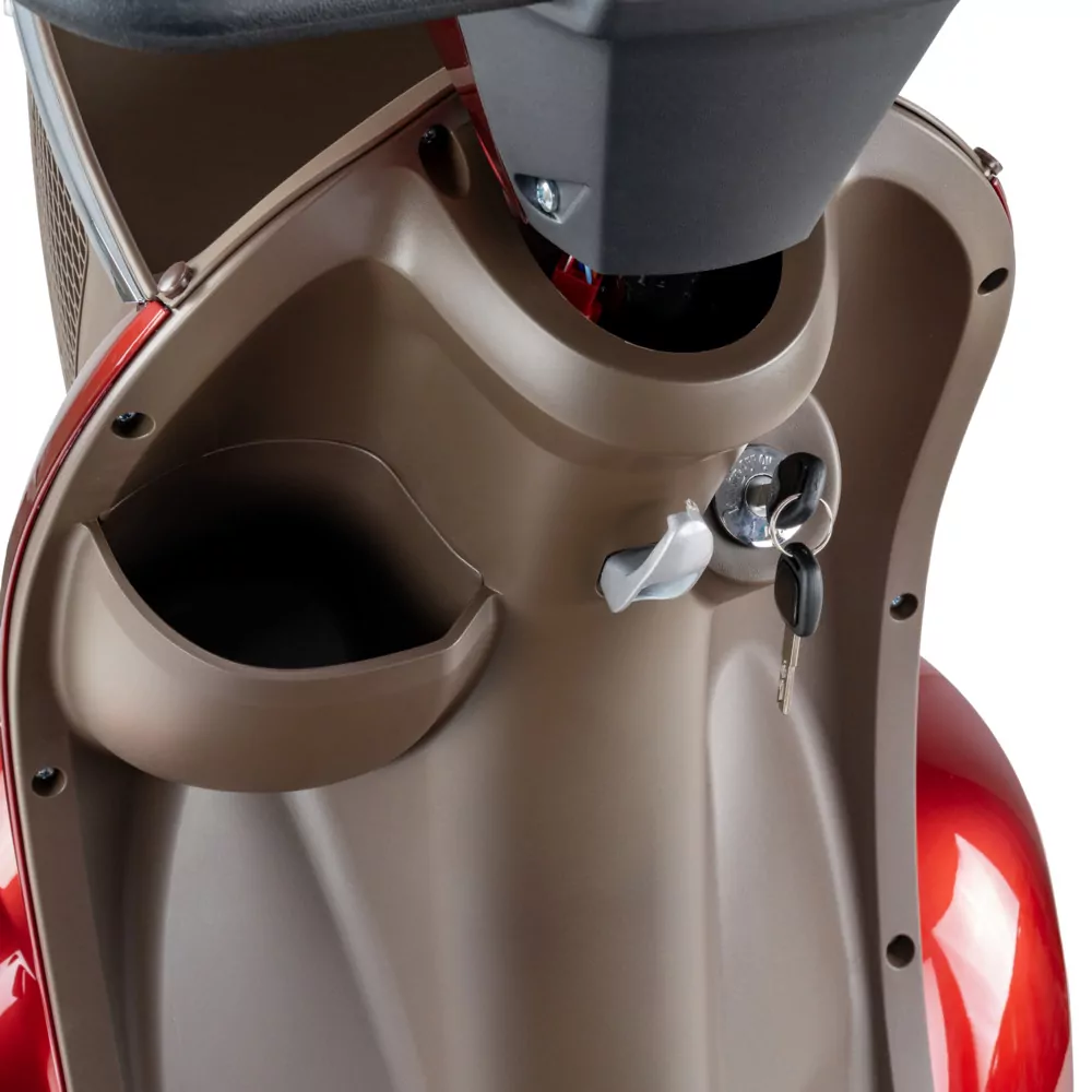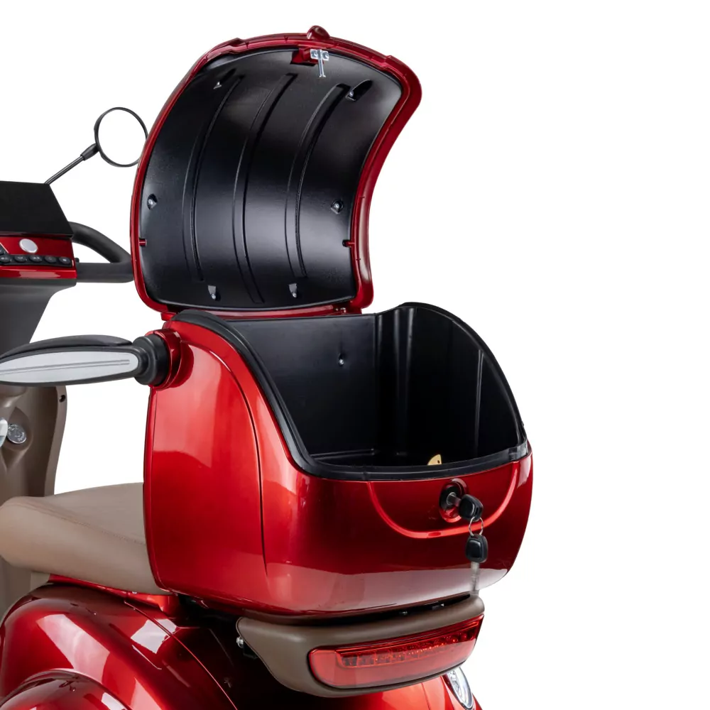 Wszystko, co najważniejsze pod ręką Dzięki schowkowi pod kolumną kierowniczą przewieziesz to, co niezbędne np. butelkę wody lub klucze. Pod siedzeniem jest zamykany schowek (otwierany ze stacyjki). Pojazd posiada również uchwyt na torby, a także duży, pojemny kuferek znajdujący się z tyłu skutera, co daje łącznie sporą pojemność transportową. Kuferek ten jest w zestawie wraz ze skuterem bez dopłaty.
