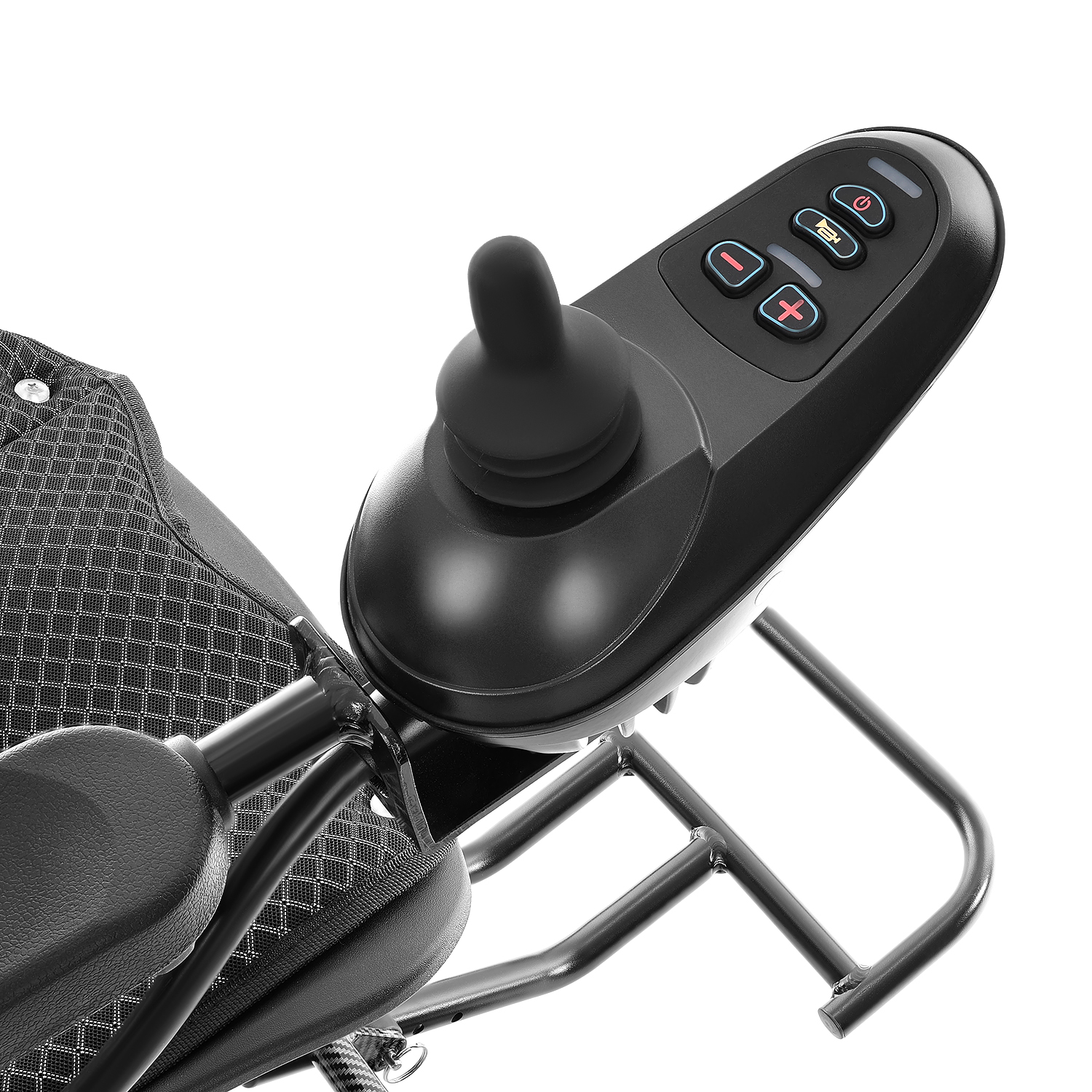 Wózek inwalidzki elektryczny AT52326 z ultralekką aluminiową ramą, odchylanymi podłokietnikami, regulowanym podnóżkiem oraz hamulcami postojowymi.