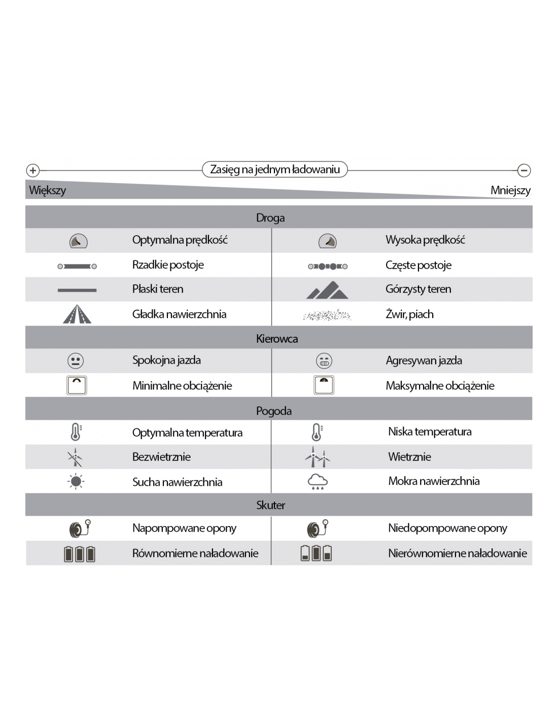 | info: | *Zasięg zależy od wagi użytkownika, warunków atmosferycznych, prędkości oraz podłoża |