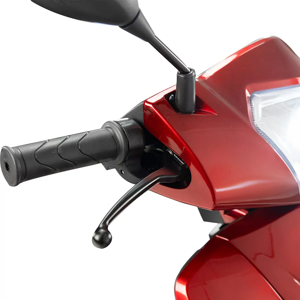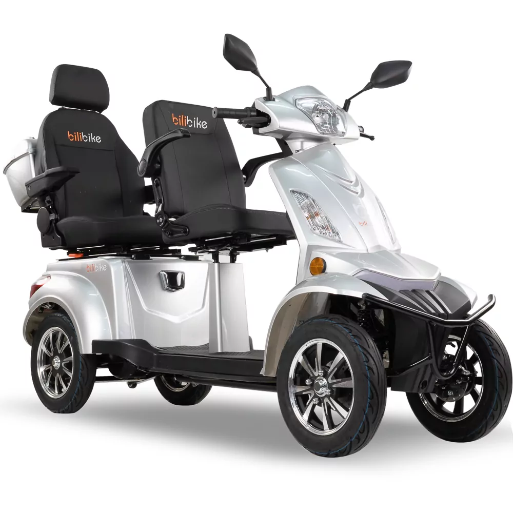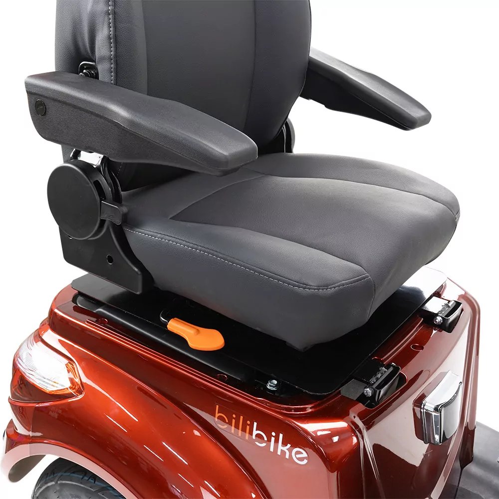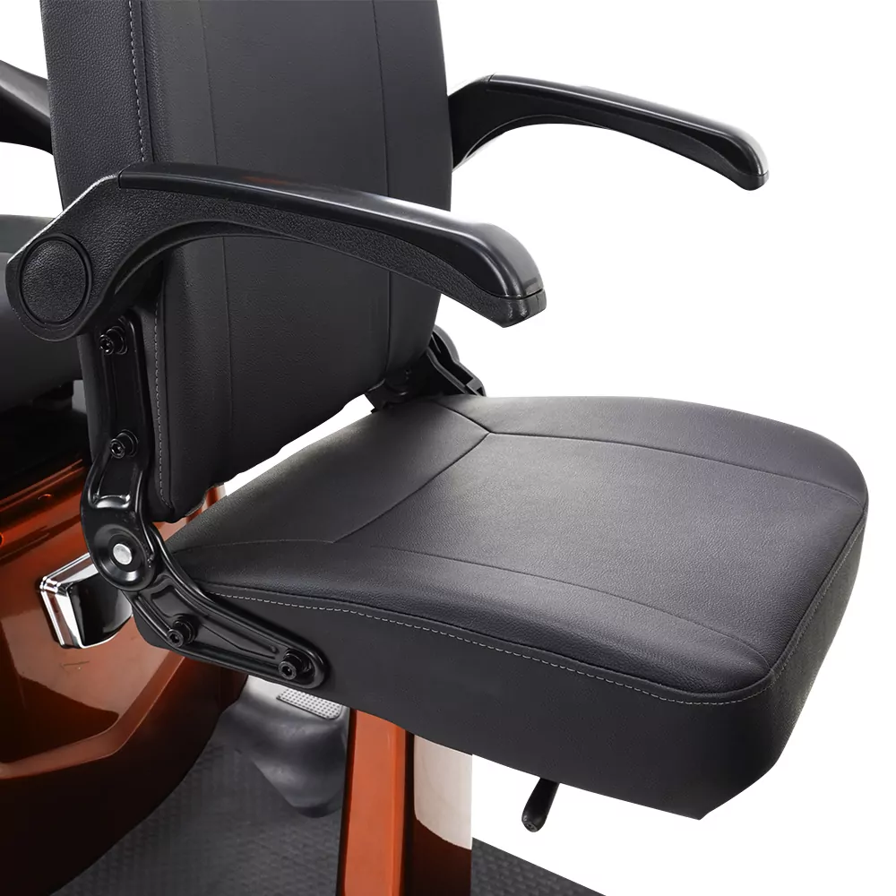 Wygoda dla dwóch osób – z pełną regulacją. Ten dwuosobowy skuter elektryczny został zaprojektowany z myślą o maksymalnym komforcie zarówno dla kierowcy, jak i pasażera. Oba fotele są przesuwane do przodu i tyłu, mają regulowane oparcie oraz podłokietniki, które można łatwo odchylić, aby wsiadanie i wysiadanie było wygodne. Z kolei fotel pasażera wyposażono w regulowany zagłówek. Dwa fotele pozwalają na wspólne podróżowanie i cieszenie się mobilnością.