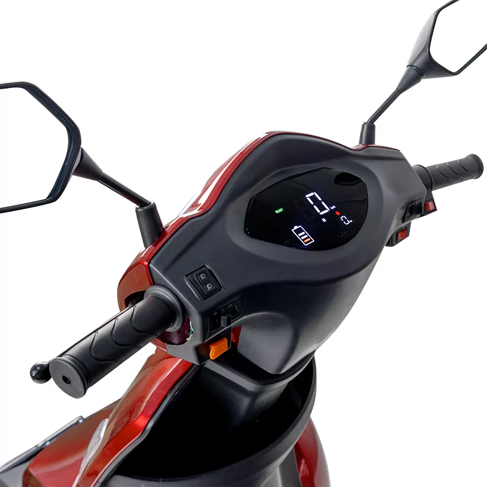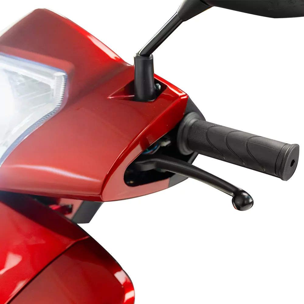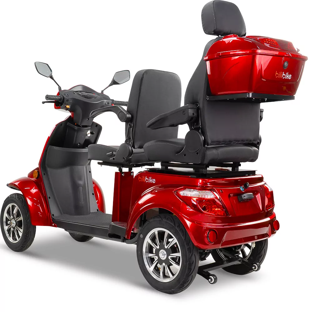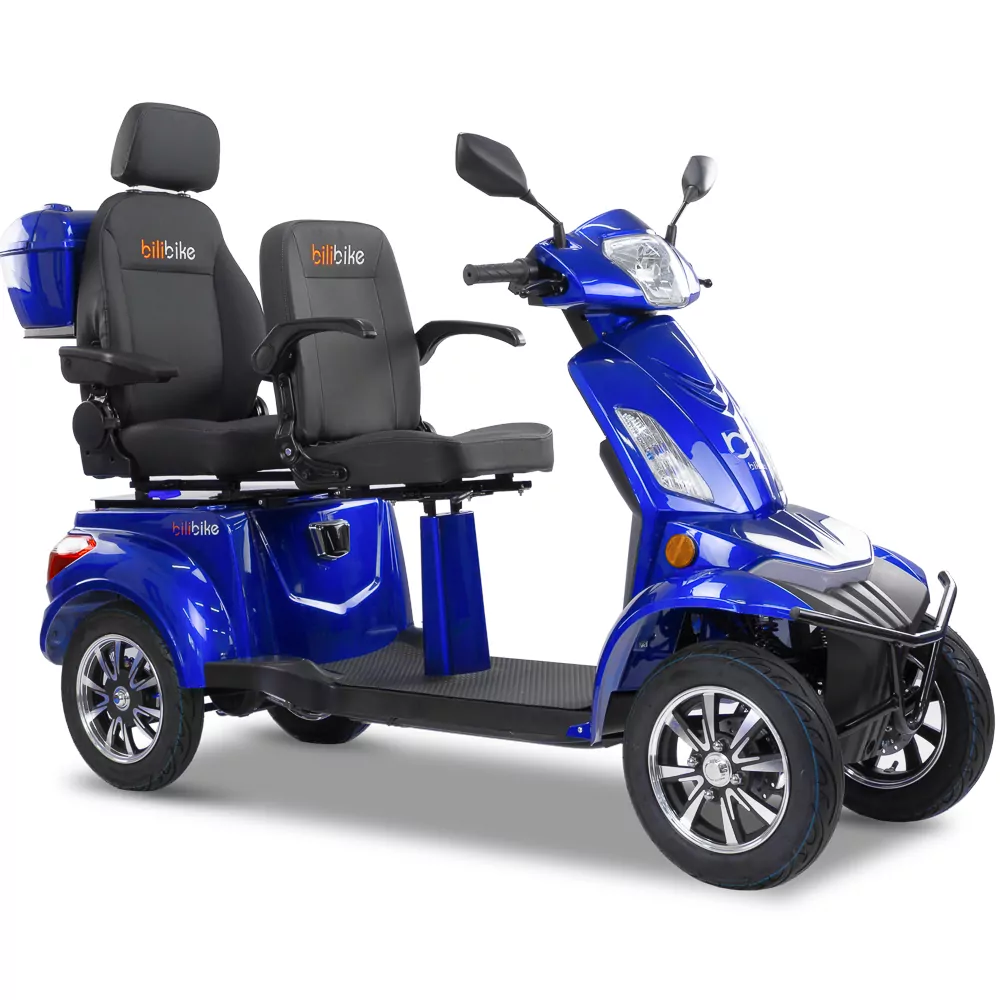 Wygoda dla dwóch osób – z pełną regulacją. Ten dwuosobowy skuter elektryczny został zaprojektowany z myślą o maksymalnym komforcie zarówno dla kierowcy, jak i pasażera. Oba fotele są przesuwane do przodu i tyłu, mają regulowane oparcie oraz podłokietniki, które można łatwo odchylić, aby wsiadanie i wysiadanie było wygodne. Z kolei fotel pasażera wyposażono w regulowany zagłówek. Dwa fotele pozwalają na wspólne podróżowanie i cieszenie się mobilnością.
