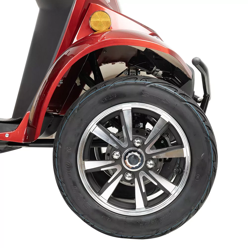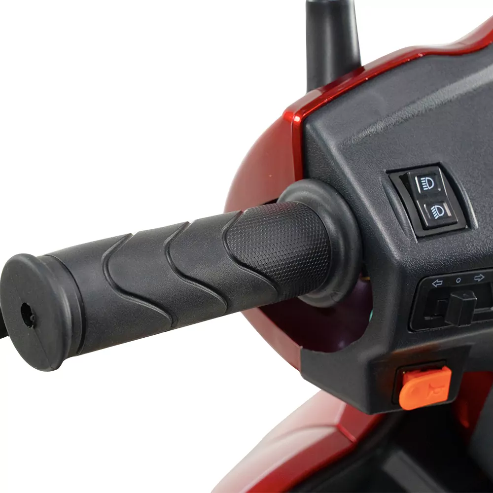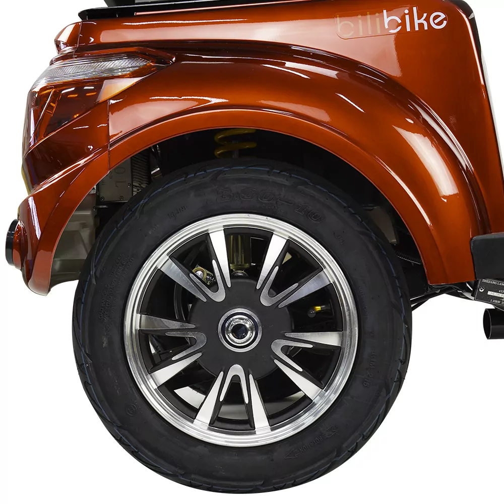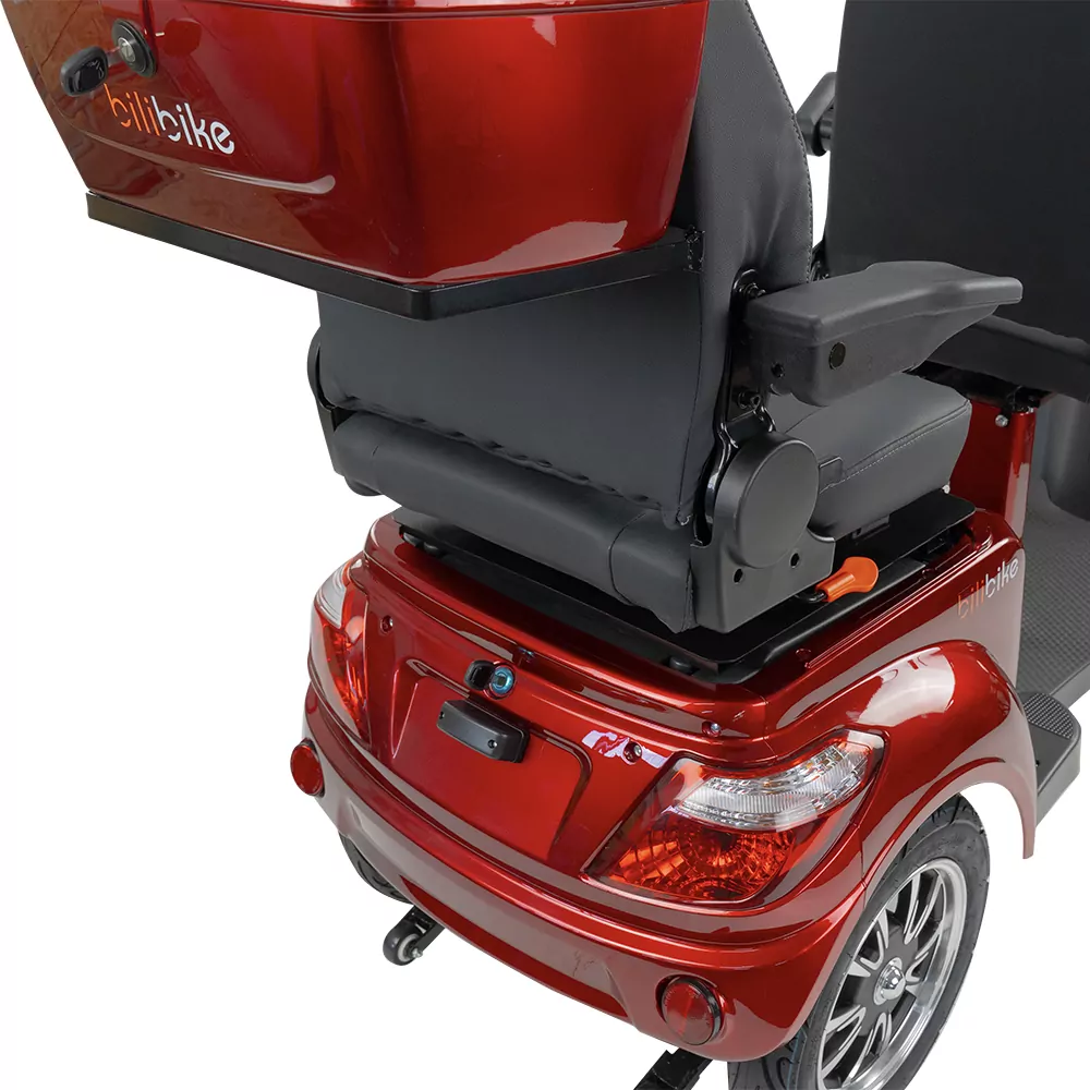 Posiada odchylane podłokietniki oraz wygodne 2 niezależne fotele z regulacją długości siedziska. Dzięki dodatkowym dwóm kołom pojazd jest stabilny, wsiadanie i zsiadanie jest wygodne. Zawieszenie jest zestrojone komfortowo, tak aby zapobiegać wszelkim dolegliwościom bólowym i zapewnić wygodne przemieszczanie bez wstrząsów.