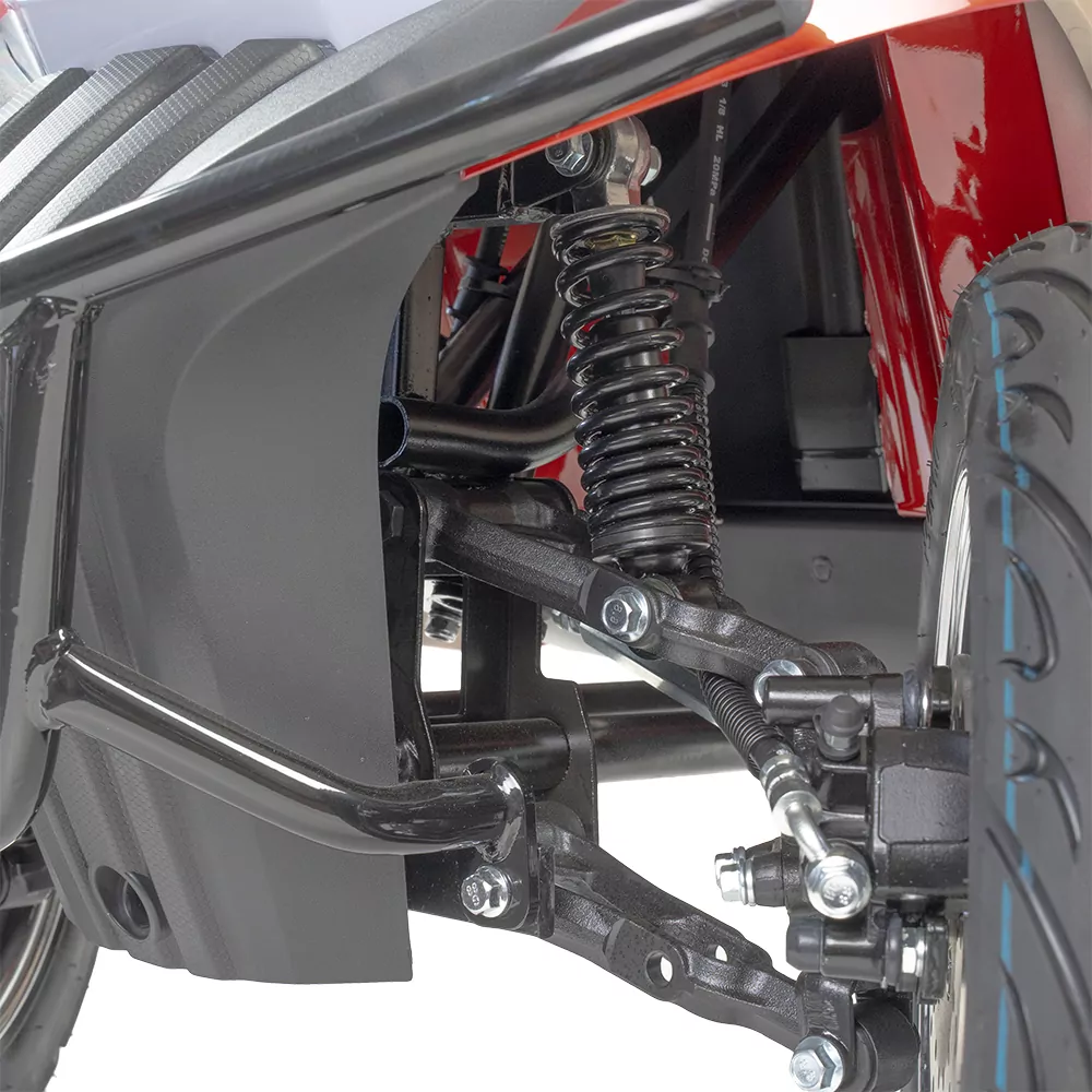 Pełna amortyzacja sprawia, że każda podróż jest znacznie bardziej komfortowa, zwłaszcza podczas jazdy we dwoje. System ten skutecznie tłumi wstrząsy i wibracje, które pojawiają się podczas jazdy po nierównych nawierzchniach, takich jak kostka brukowa, wyboje czy krawężniki.
